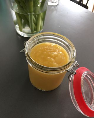 A la casserole : mettre le jus, les zestes, le sucre, la fécule et les œufs et faire cuire le tout en tournant avec une cuillère en bois jusqu’à ce que le lemond curd épaississe un peu comme la crème pâtissière. Une fois cuit le mettre dans un bocal pour refroidir.